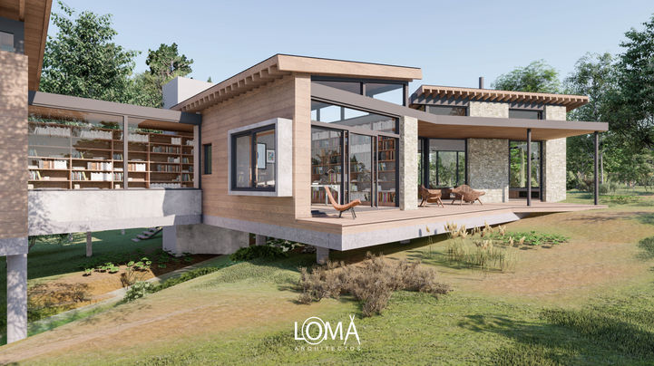 La zona sur (dormitorio principal), se encuentra retirado del resto de la vivienda, con este canal biblioteca completamente vidriado hacia la orientación este. La idea era brindarles a los clientes, la mayor tranquilidad, debido a que este sector, permite percibir con mayor claridad el sonido del arroyo.