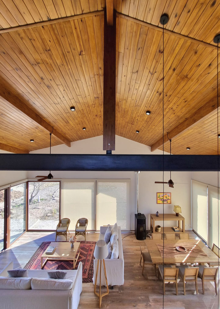 La relación con el entorno es directa e ininterrumpida gracias a grandes paños de vidrio, que enmarcan la inmensidad del paisaje serrano. Sin embargo, la casa puede desvincularse de ese exterior mediante un sistema de portones corredizos y postigos, que permiten cerrar completamente el refugio durante las temporadas de desuso, protegiéndolo de tormentas, fauna y otras inclemencias.