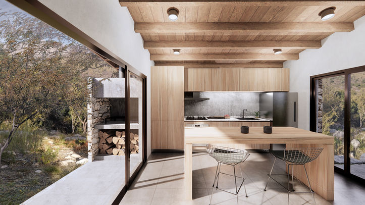 Hacia el noreste, se extiende una pequeña galería con asador, que funciona como apertura del espacio interior.